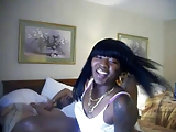Schwarzhaarige Shemale tanzt auf dem Tisch bevor sie ihren kleinen Schniedel wichst